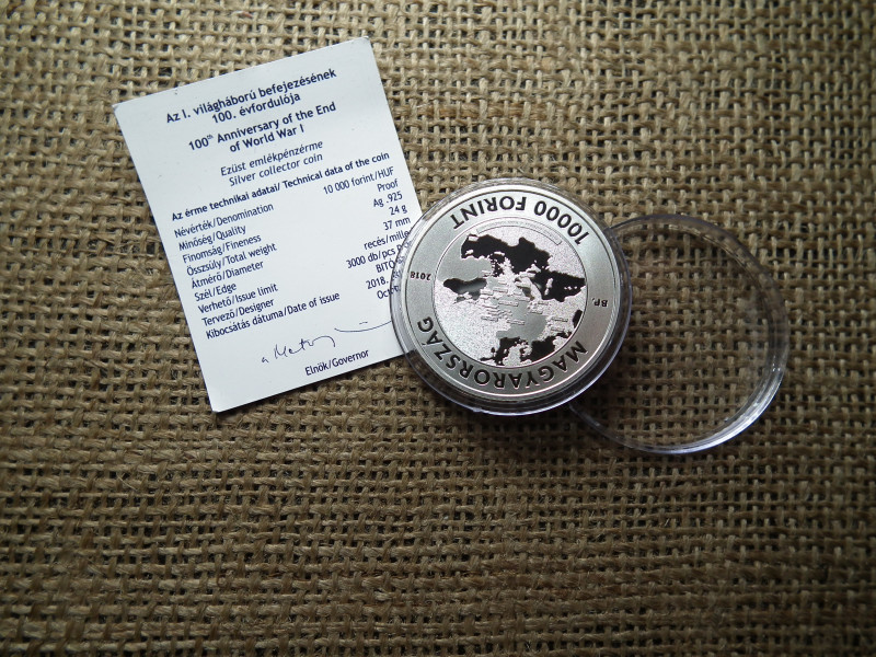 I.VILÁGHÁBORÚ BEFEJEZÉSÉNEK EMLÉKÉRE / EZÜST 10000 FORINT 2018 PP + certi , D