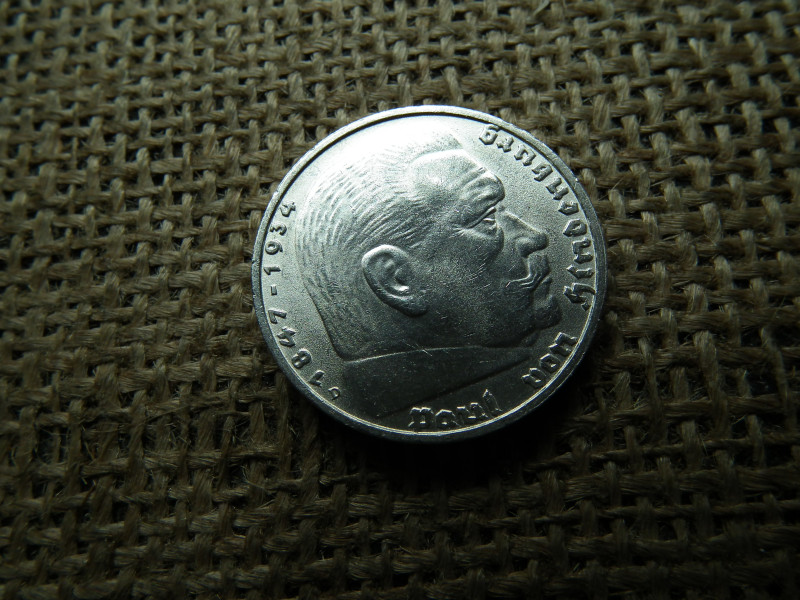 Birodalmi ezüst 5 márka 1938 D , Nagy sasos - horogkeresztes , extra