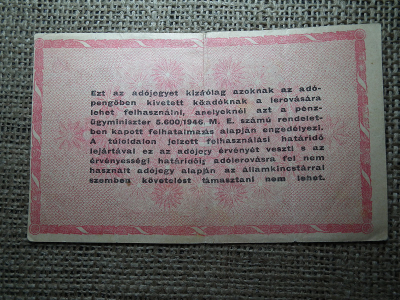 Egymillió Adópengő 1946 , 6 számjegyű sorszám , vízjeles , fordított címer