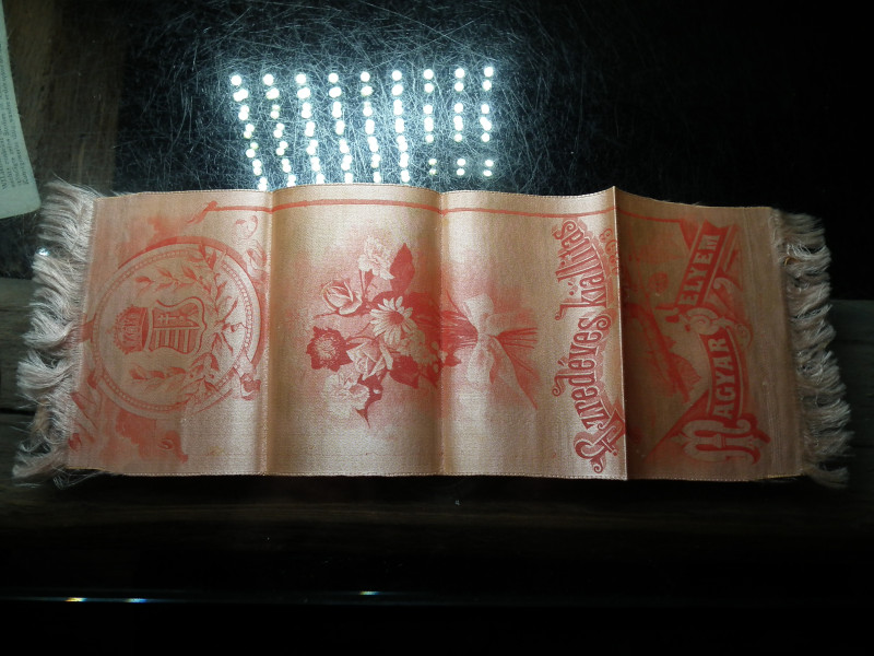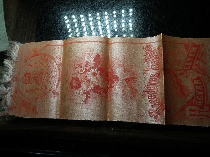 Rózsacsokorral és koronás címerrel díszített sárga selyemanyag mindkét végén rojtokkal, felirata: Ezredéves k...... tovább