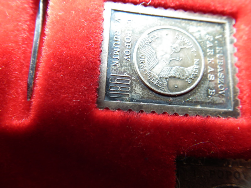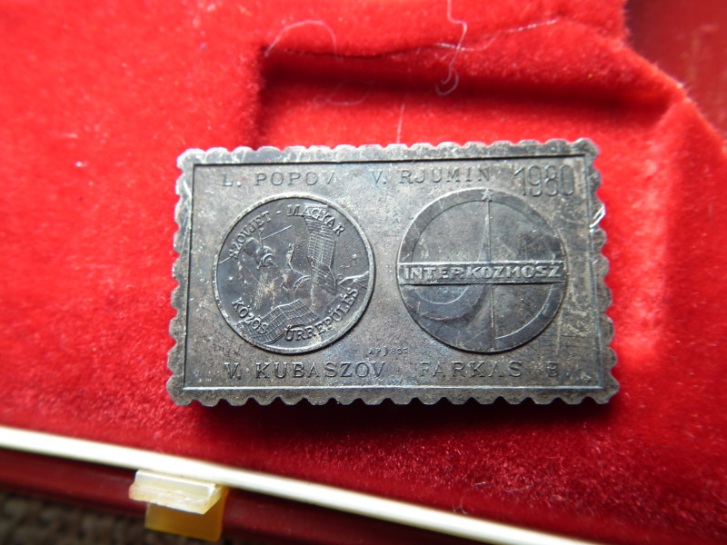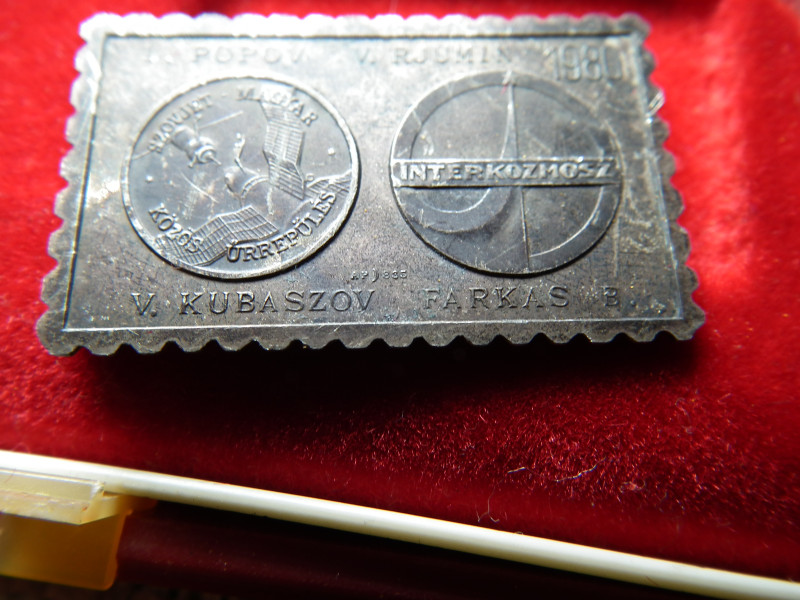 SZOVJET - MAGYAR ŰRREPÜLÉS PLAKETT és JELVÉNY 1980 EZÜST , Interkozmosz , doboz sérült ! Bélyegérem , kitűző