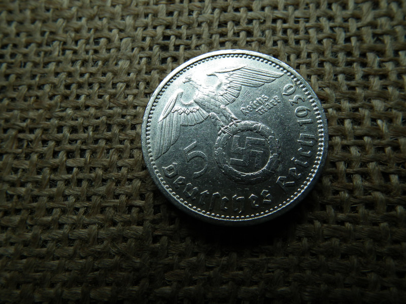 Birodalmi ezüst 5 márka 1936 D , Nagy sasos - horogkeresztes