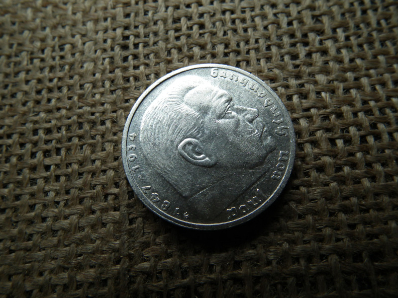 Birodalmi ezüst 5 márka 1938 G , Nagy sasos - horogkeresztes