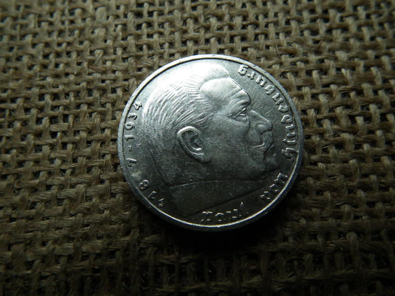 Birodalmi ezüst 5 márka 1938 J , Nagy sasos - horogkeresztes , Verdehibás , idegen anyag benyomódás , 1847 évszámban
