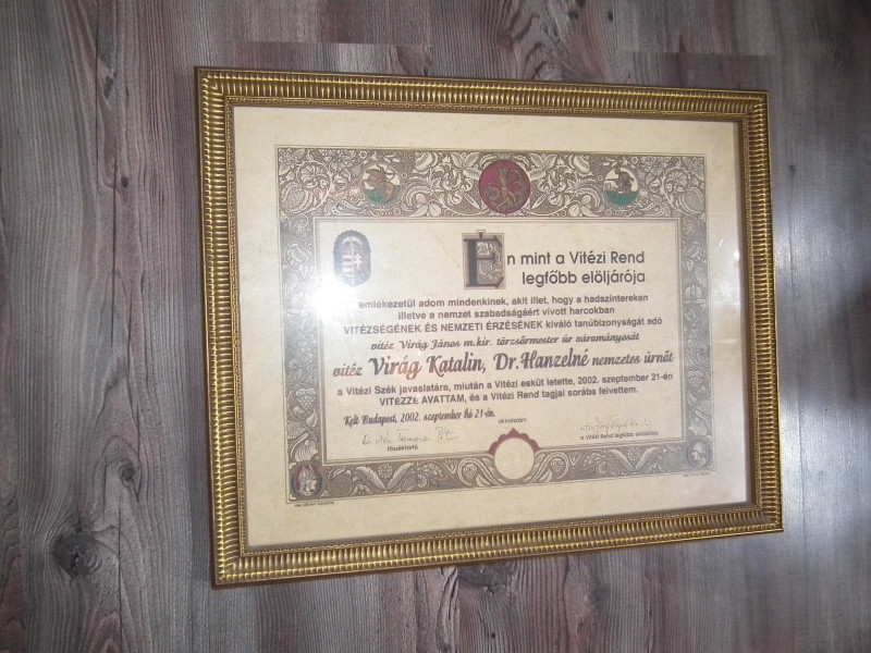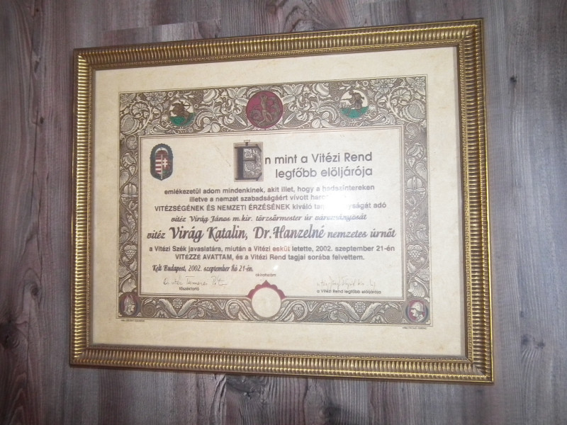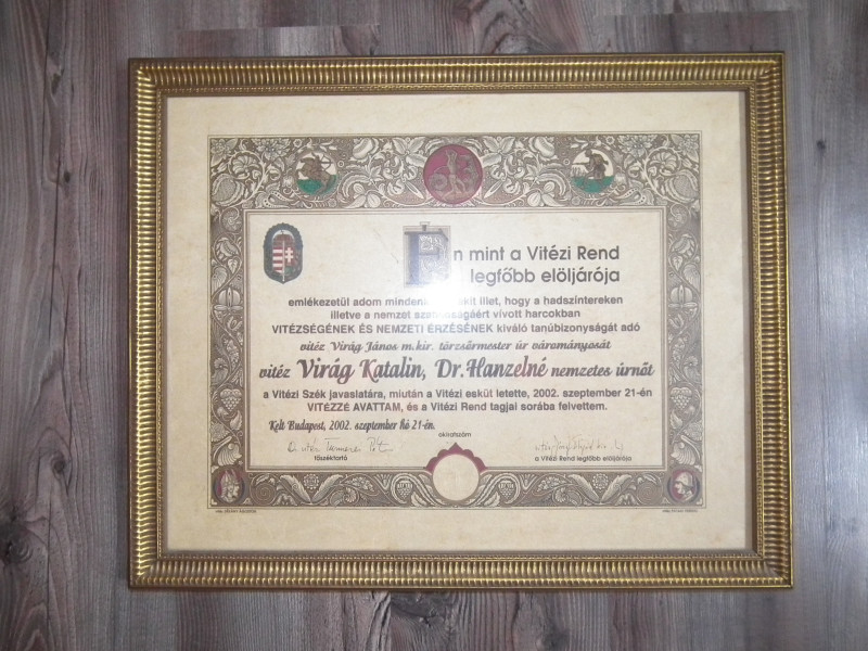Vitézi Rend Adományozó , Avatási Oklevél , 2002 , Budapest.