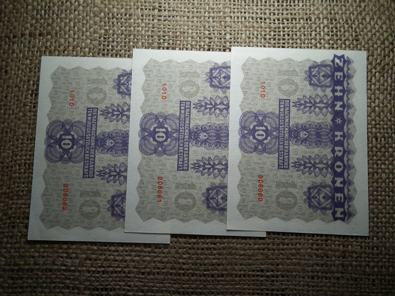 10 korona 1922 , hajtatlan , 3 db sorszámkövető