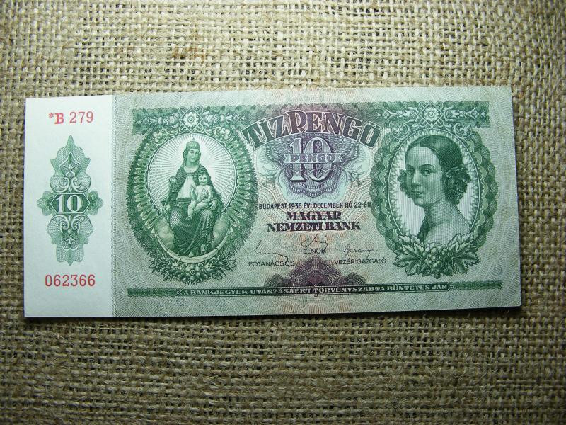 Ez a 10 pengős papírpénz 1936-ban került nyomtatásra, és a korabeli magyar fizetőeszközök közé tartozik. A bankjegy csillagos változatban készült, amely különleges megjelenést kölcsönöz neki. A hajtat... tovább