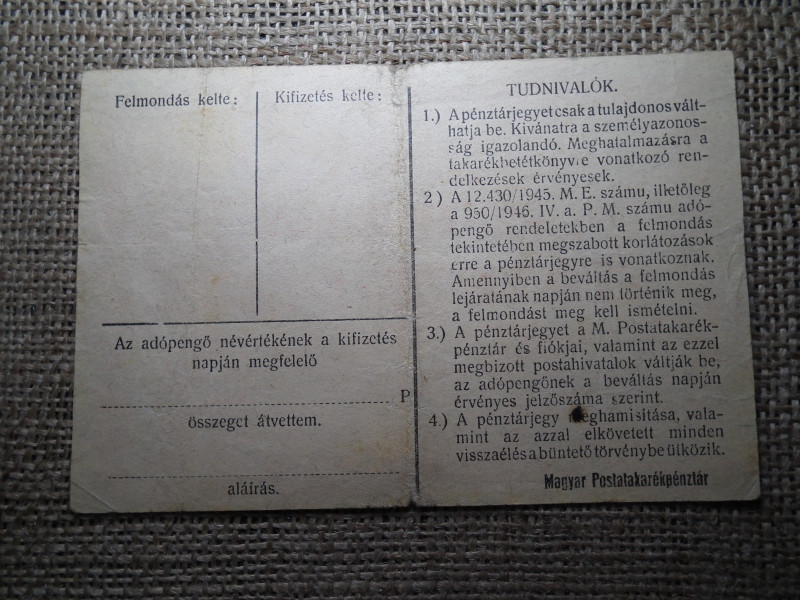 PÉNZTÁRJEGY SZÁZEZER ADÓPENGŐRŐL 1946 , Adópengő , Sárvár pecsét !