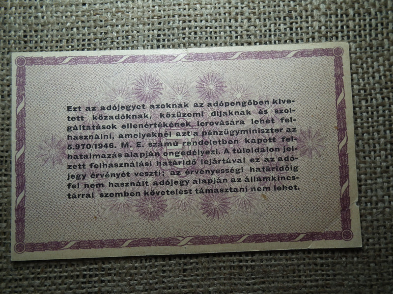 A Százezer adópengő 1946 egy ritka és különleges papírpénz, amely az 1926-1946 közötti korszak pénzügyi emlékeit őrzi numizmatikai gyűjteményekben. Eredeti vízjeles és sorszámos kivitelezése a történelmi jelentőségére hívja fel a figyelmet. A Százezer adópengő 1946 egy igazi kincs a magyar numizmatika szerelmeseinek, amely gazdagítja és történelmi értékekkel ruházza fel a gyűjteményüket. Az ilyen egyedi és különleges papírpénzek megtalálása rendkívüli élmény, ami által a kollekció még értékesebbé és exkluzívabbá válik. Szerezd be most ezt a lenyűgöző Százezer adópengő 1946-ot, hogy egy darabot is magadénak tudhass a múlt értékes pillanataiból!