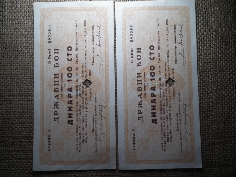 Szerbia 100 dinara 1943 , államkötvény 2 db sorszámkövető