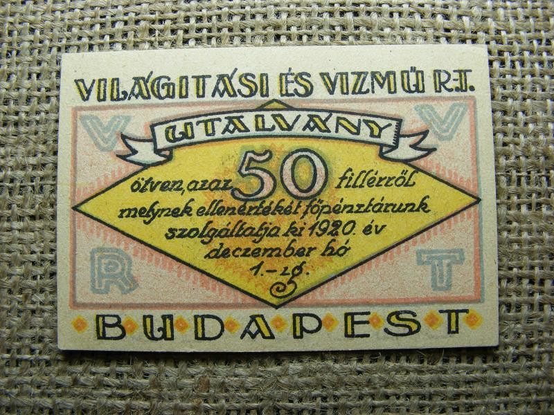 A Világítási és Vízmű R.T. által kibocsátott 50 filléres szükségpénzt 1920-ban nyomtatták. Ez a bankjegy a korabeli gazdasági körülményekre jellemző, és ma már keresett darab a numizmatika szerelmesei... tovább