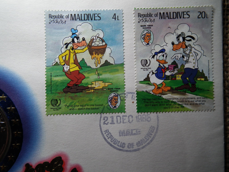 Amerika Egyesült Államok , Maldív-szigetek , érem és bélyeges boríték ! 1985 ! 30 éves Disneyland 1955 - 1985 , Kacsa és egér