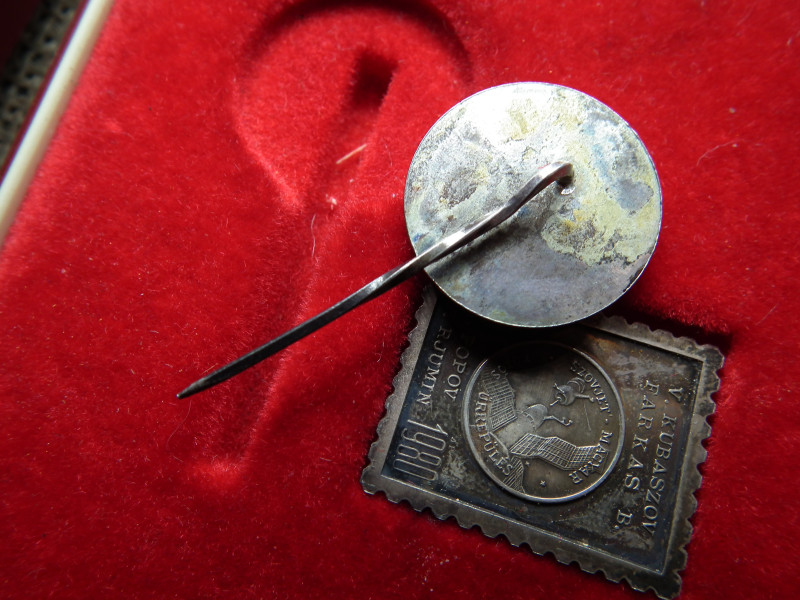 SZOVJET - MAGYAR ŰRREPÜLÉS PLAKETT és JELVÉNY 1980 EZÜST , Interkozmosz , doboz sérült ! Bélyegérem , kitűző