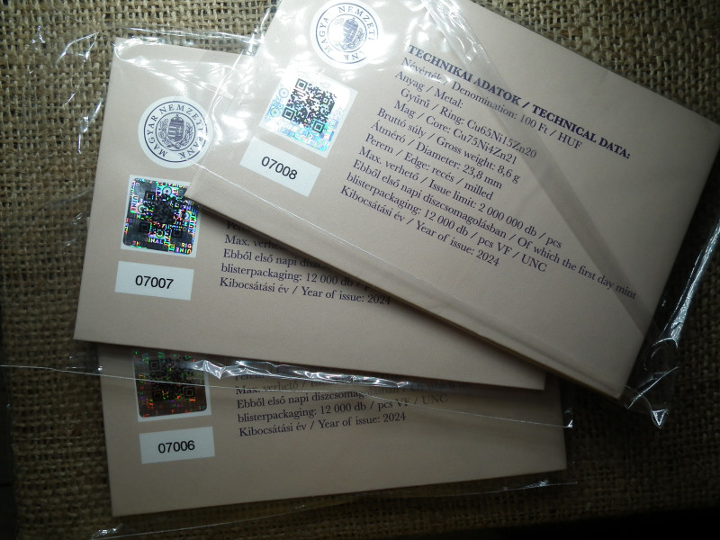 100 éves a Magyar Nemzeti Bank MNB 100 forint 2024 - első napi veret - 3 db sorszámkövető