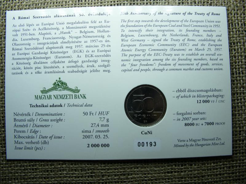 50 forintos érme, 2007, Római szerződés, elsőnapi veret