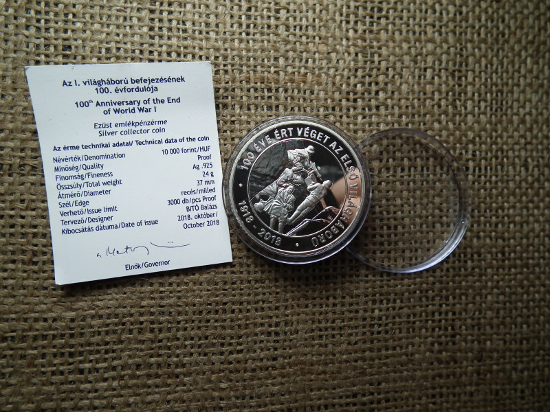 I.VILÁGHÁBORÚ BEFEJEZÉSÉNEK EMLÉKÉRE / EZÜST 10000 FORINT 2018 PP + certi , D