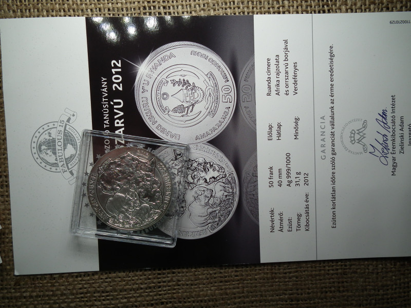 Ruanda ezüst 50 frank 2012 , francs , Orrszarvú borjával , 1 uncia szín