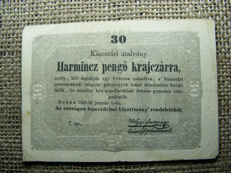 Ez a 30 krajcáros papírpénz 1849-ben készült, és ferde előlapi nyomattal rendelkezik. A bankjegy a magyar történelem egyik fontos korszakából származik, és értékes darab a numizmatika szerelmesei szám... tovább