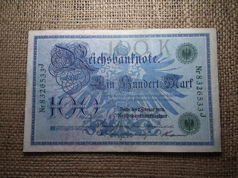 100 márka 1908 , Mark Reichsbanknote; green seal