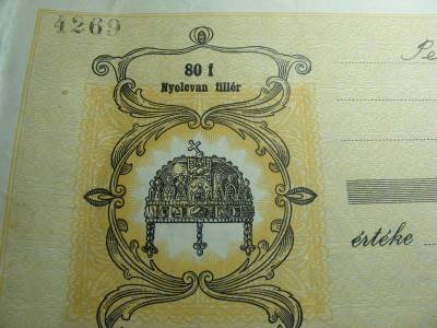 Az 1928-ban nyomtatott 80 filléres váltó bankjegy vízjeles papírból készült, amely a korabeli szükségpénzek egyik jellegzetes darabja. Ez a bankjegy a magyar történelmi pénzverés és gazdasági viszonyo... tovább