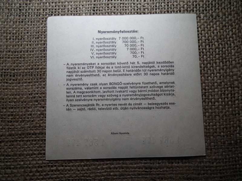 Bongó sorsjegy 1991 , 10 forint , TV1 Magyar Televízió Szerencsejáték Rt.