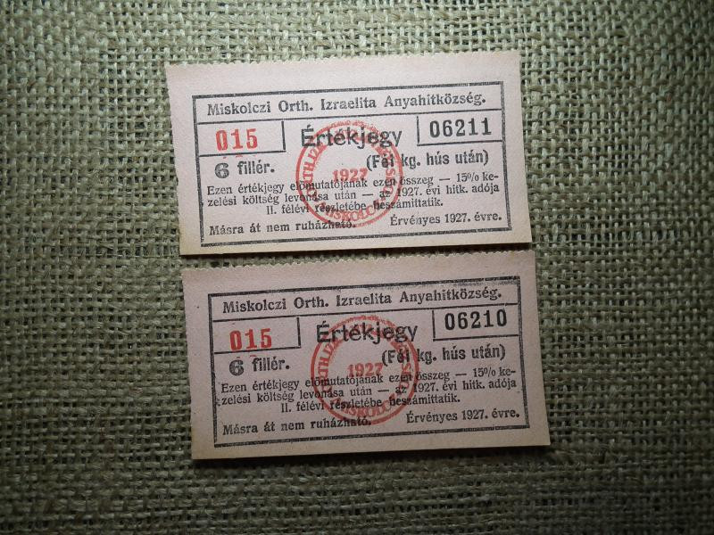 Miskolci Ortodox Izraelita Hitközség, 6 fillér, 1927, 2 db sorszámkövető