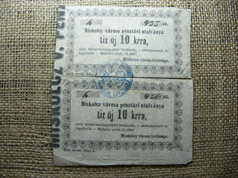 Miskolcz Városi Pénztári Utalványa, 1860, 10 krajcár