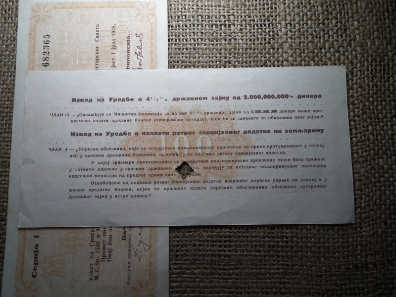 Szerbia 100 dinara 1943 , államkötvény 2 db sorszámkövető