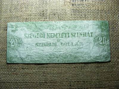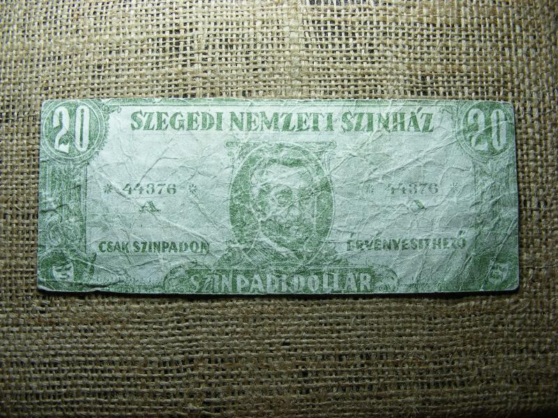 Ez a színházi kellékpénz a Szegedi Nemzeti Színházhoz kapcsolódik, és szükségpénzként szolgált. A bankjegyet a színházi előadások során használták, és egyedi történelmi értéket képvisel. A papírpénz k... tovább